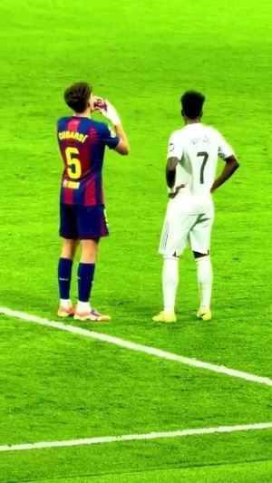 在比赛中,皇马边锋维尼修斯从场边拿了一瓶水走进场内,口渴的巴萨后卫库巴西上前讨水喝,巴西人没有犹豫直接递给了西班牙后卫。
